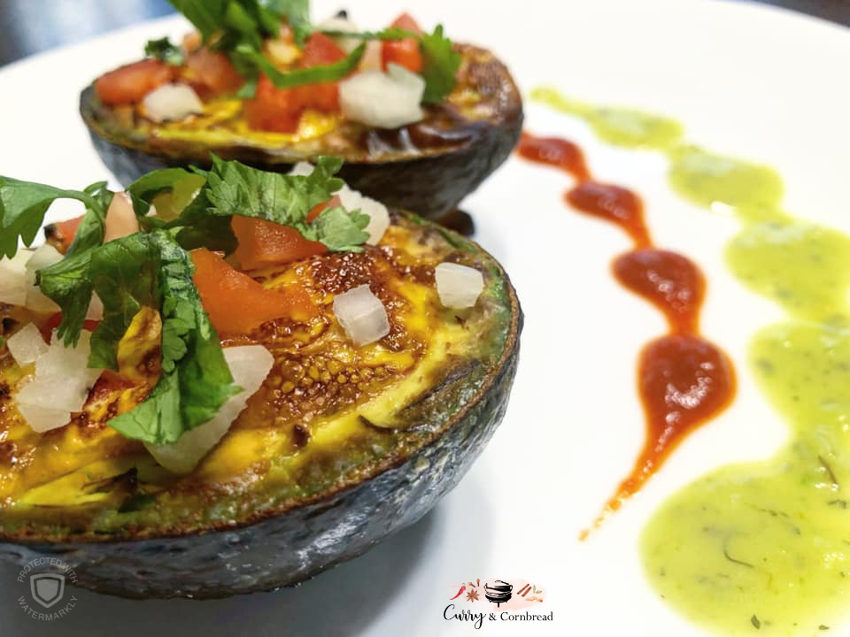 Preheat oven to 350F or you can also make these in your air fryer. Carefully scoop out enough avocado from the center for each half to make room for an egg. In a baking dish with sides, place avocado halves cut side up. Press little to get somewhat of flat surface. Crack an egg in each half of the avocado. Add your veggies, seasonings (salt, chili powder, garlic powder, turmeric, cumin-coriander powder) on top and bake at 350F for 15-20 minutes or 450F in air fryer for 10 minutes. You can drizzle any sauce you like prior serving. I love eating my eggs with avocado salsa and sriracha sauce.