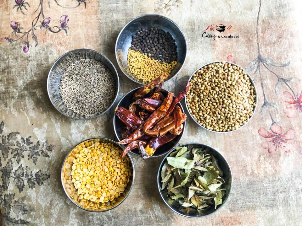 First dry roast all the ingredients separately on low flame. Remove off heat and let it cool. Add in the dry roasted spices in blender jar and grind until smooth powder. Add turmeric powder and asafetida. Let the mixture cool completely and store in airtight container. This powder is good for 3-4 months.