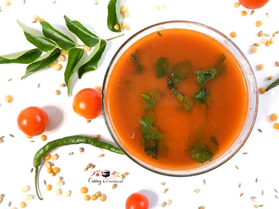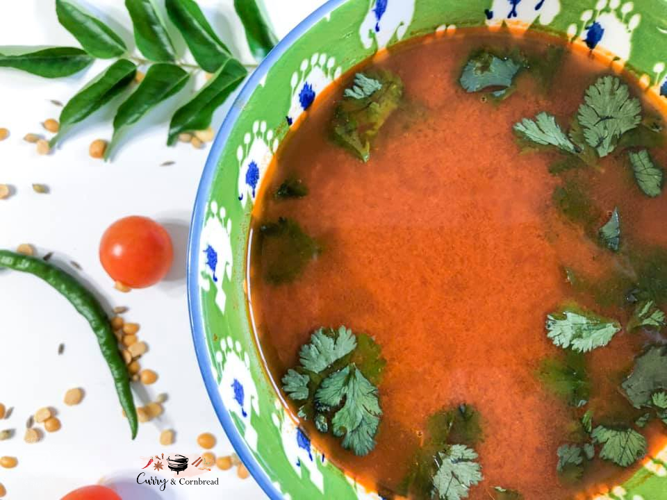 This is my all-time favorite Tomato Rasam. Rasam is a delicate thin flavored broth or soup from the South Indian cuisine that is tamarind based, has freshly ground spices, some dal or lentils and curry leaves. Rasams are very much alike the shorba that can be consumed as an appetizer or can be sipped throughout the day when suffering from nasal congestion. It is warm, comforting and soothing. Rasam is the first home remedy I reach out to prior anything when I am sick, this even includes medicines.