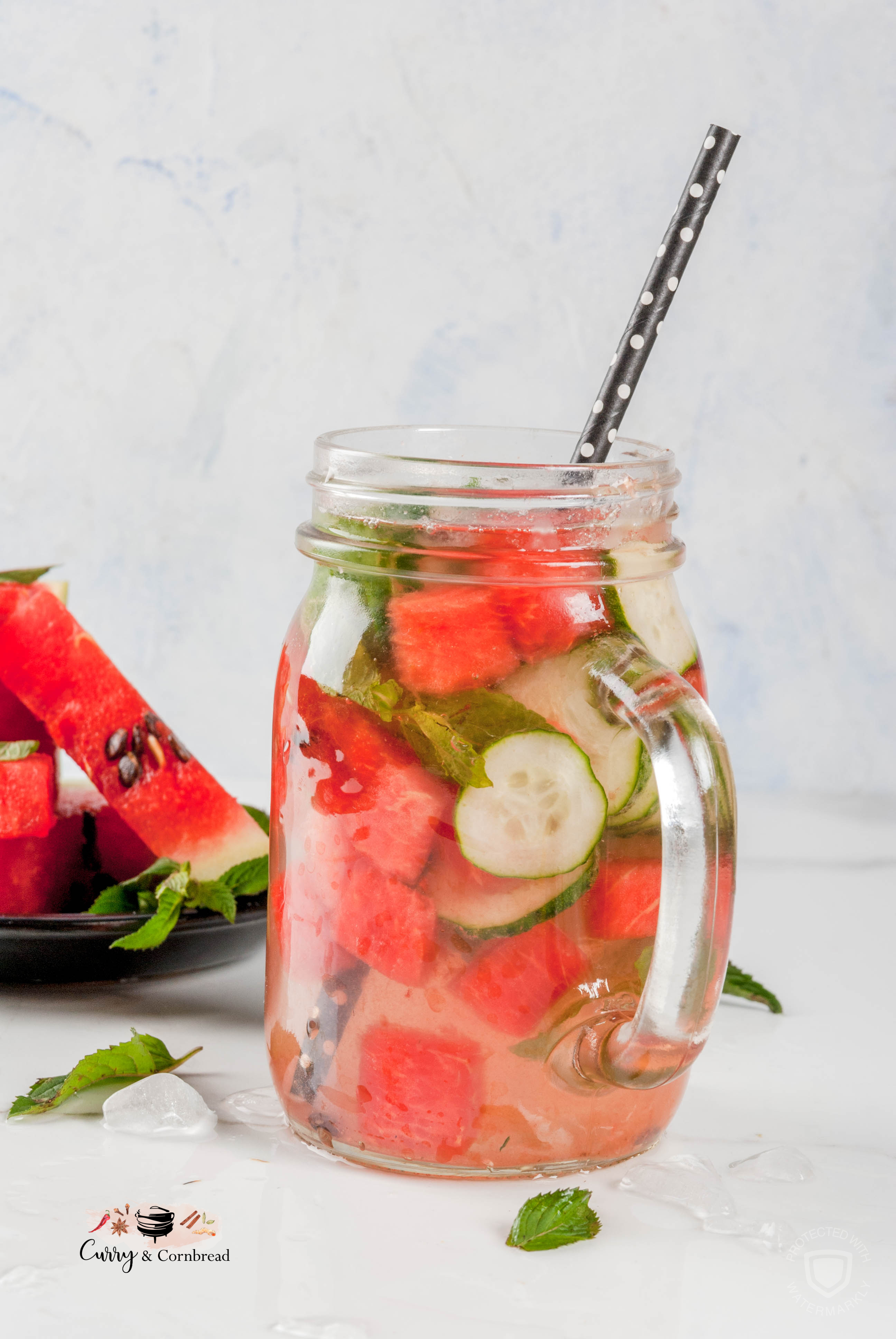 Watermelon + Cucumber + Lime: 4-5 watermelon cubes, 4-5 slices of cucumber, 3-4 slices of lime, water, ice cubes (optional)