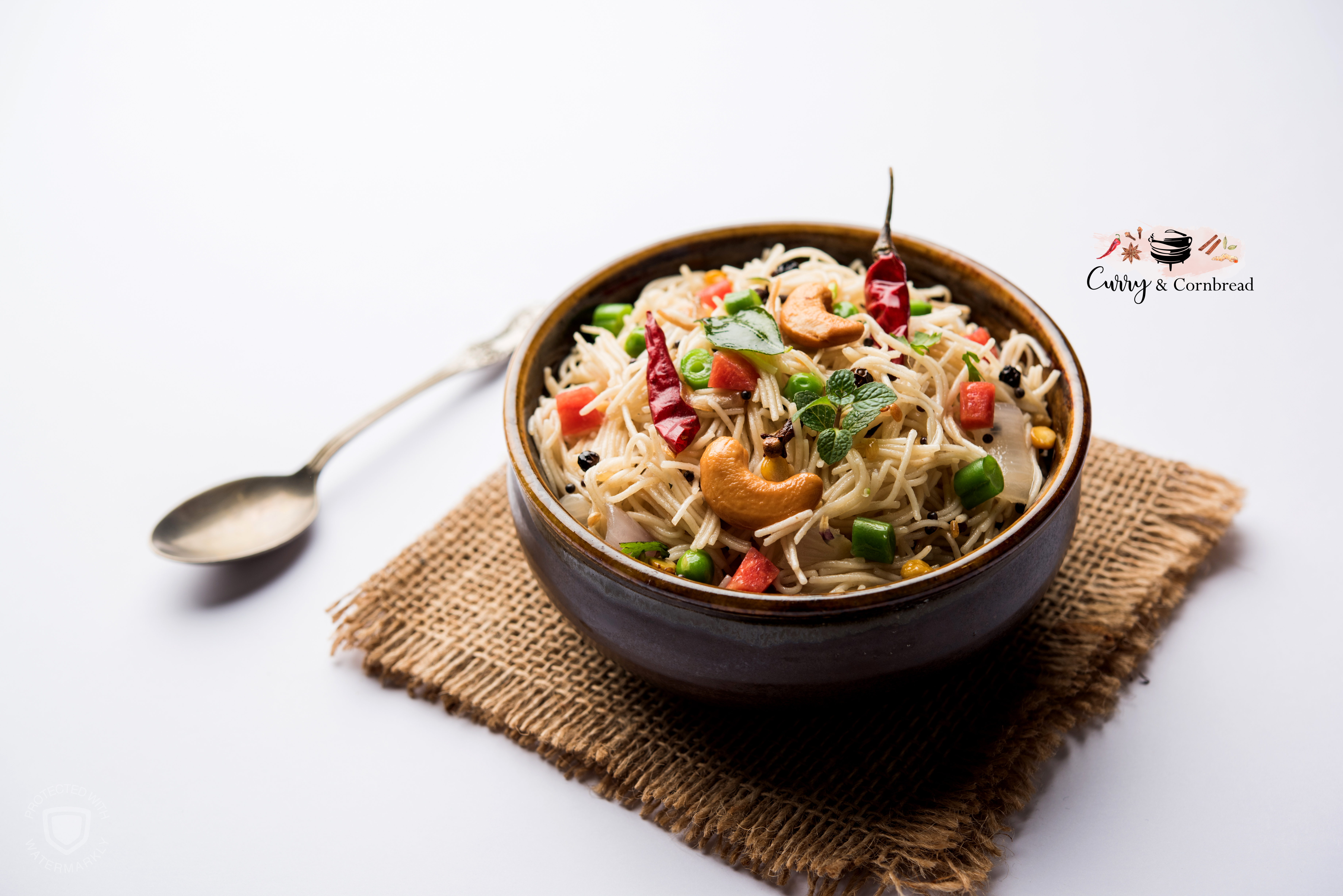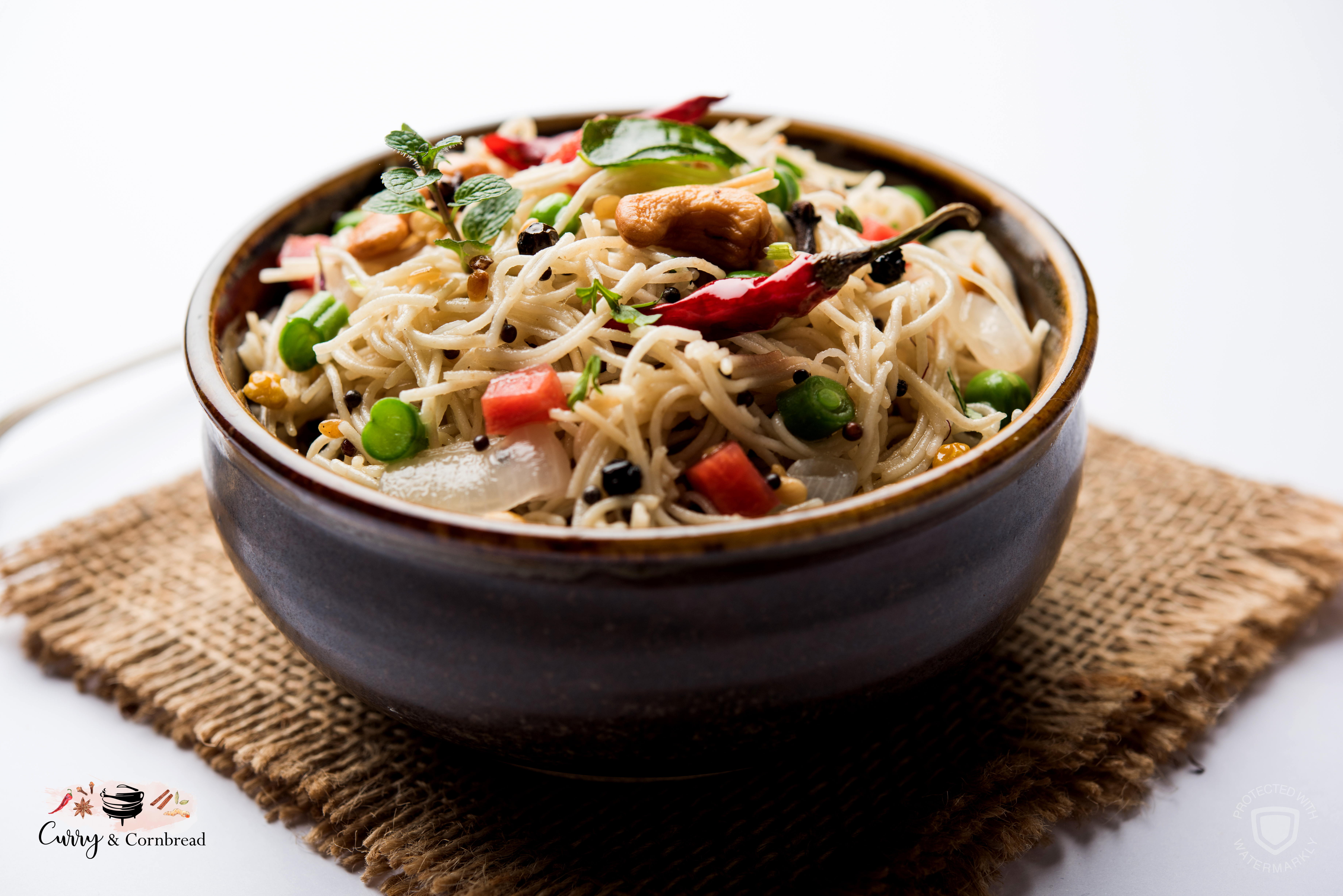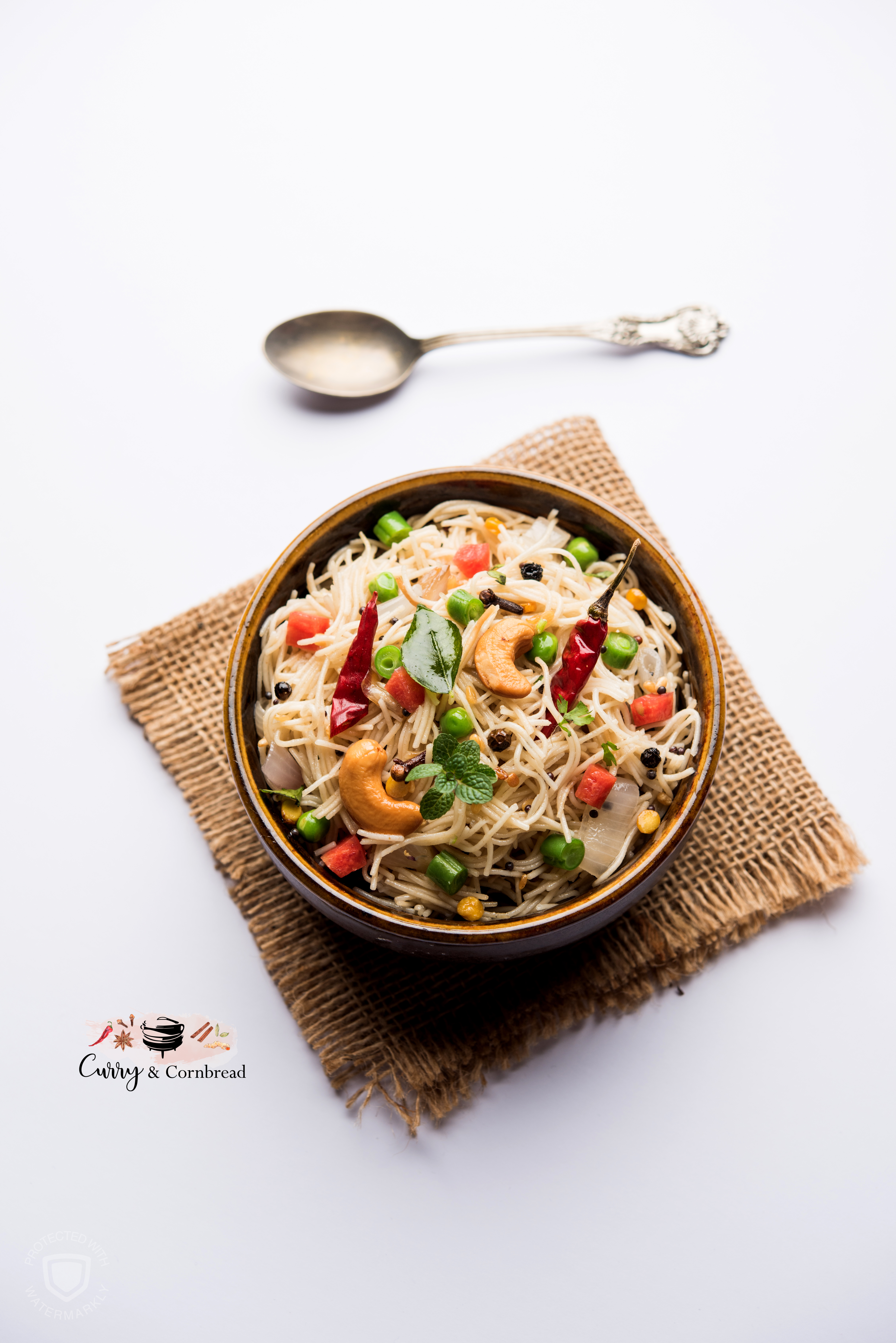 Heat oil in a medium size pan. Add the mustard seeds and let them splutter. Add the curry leaves, urad dal, chana dal, cashews, and chilies. Once the dals turn golden brown, add onions and sauté until they are translucent. Add chopped veggies and sauté for 5 minutes. Add water, salt and give it a quick stir. Wait until the water just starts to boil. Add the vermicelli to the pan and mix nicely. To avoid clumps, you have to keep stirring gently every couple of minutes. Cook covered in low to medium flame for 2-3 minutes or until the vermicelli is cooked through. Vermicelli Upma is ready to be served as breakfast, lunch or dinner!