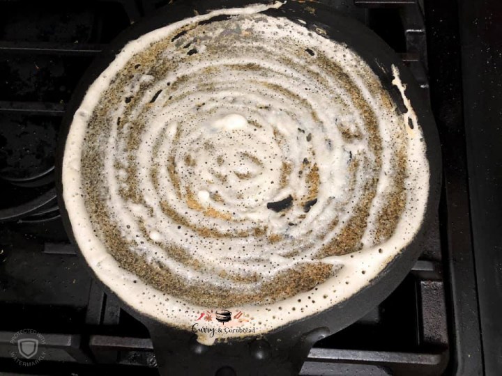 For Dosa – Consistency of the batter should be like pancake batter. If too thick than add water. Heat 10 inch non stick or cast iron pan over medium heat.