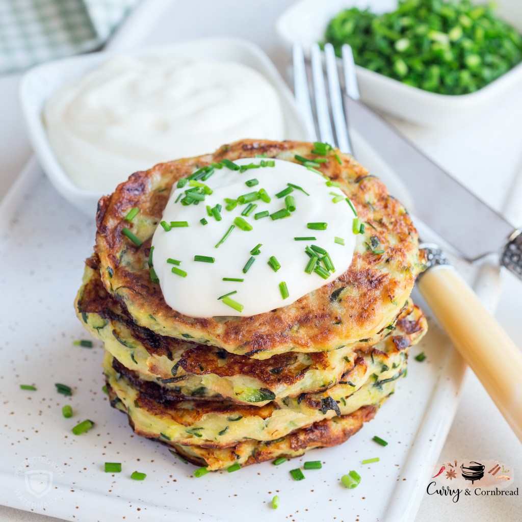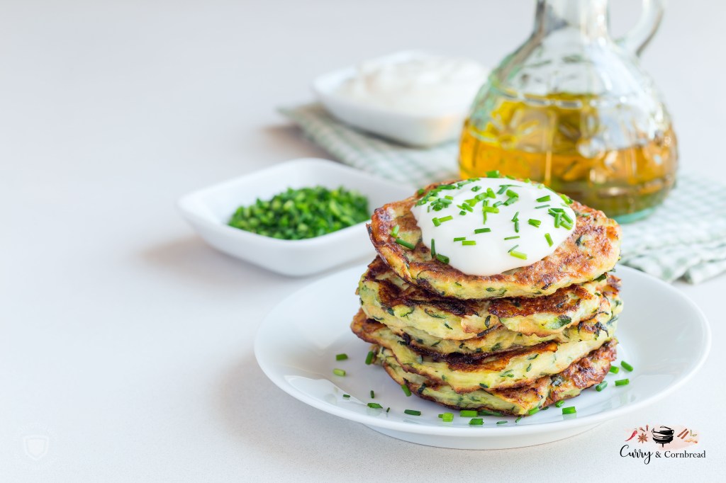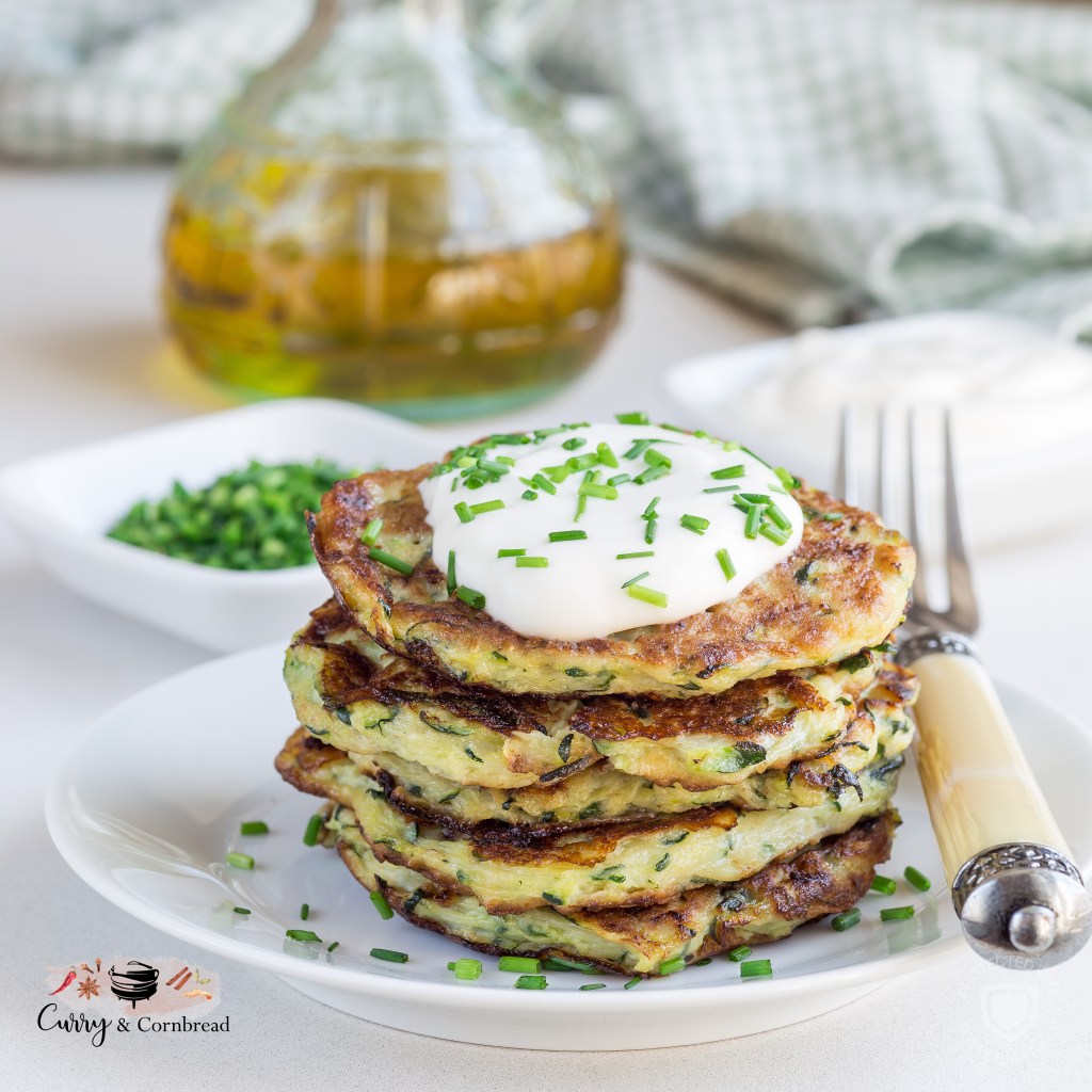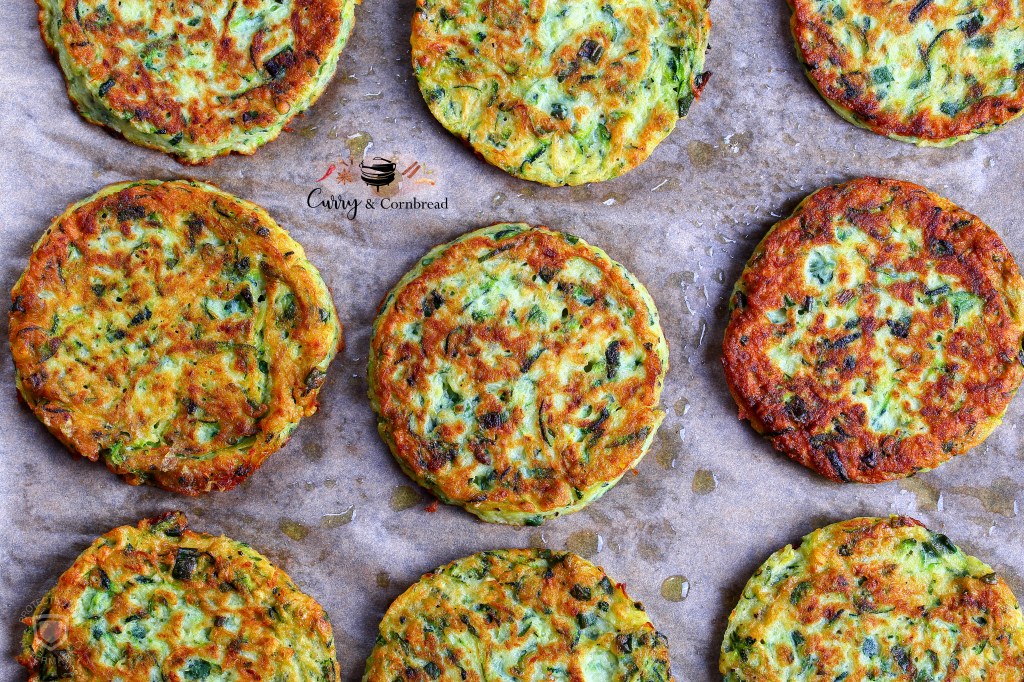 Baked – You can also pop them in the oven if you wish. Preheat oven to 350 F. Line a baking sheet with parchment paper, scoop out 4′ in diameter dollops and flatten with a spatula. Spray with olive oil and bake the zucchini fritters until golden brown. About 15 minutes on each side, spraying again with olive oil after flipping them. Serve immediately.