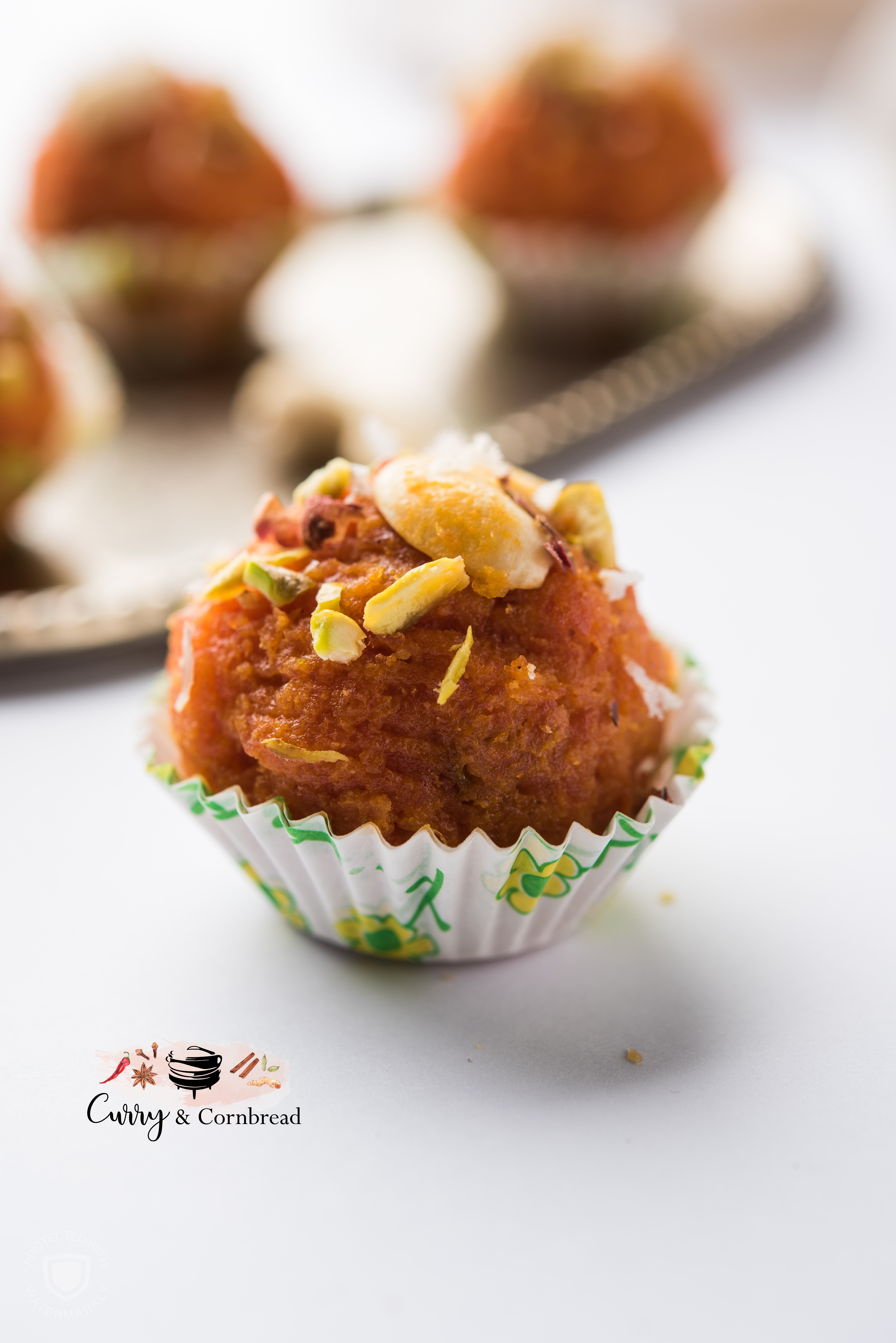 Prep all your ingredients. In a wide medium size pan, melt 1 tbsp ghee or butter. Once hot, add grated carrots and sauté on medium heat until carrots are softened. Keep sautéing until moisture evaporates, this whole process takes approximately 10 minutes. Add cardamom powder, coconut and sweetened condensed milk. Mix thoroughly and cook on low flame, constantly stirring the mixture. Make sure to cook thoroughly for another 10 minutes or until the mixture starts to roll like a ball. It should be thick mixture, slightly sticky. Turn off the flame, let the mixture cool completely. Coat your hands in ghee prior making the medium size truffles. You can roll them into desiccated coconut or sliced/chopped nuts or decorate with nuts on the top. Place each truffle in small cupcake liner and refrigerate them prior serving. You can store them in the refrigerator in airtight container for up to 3 days.