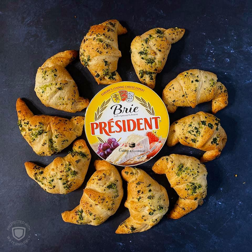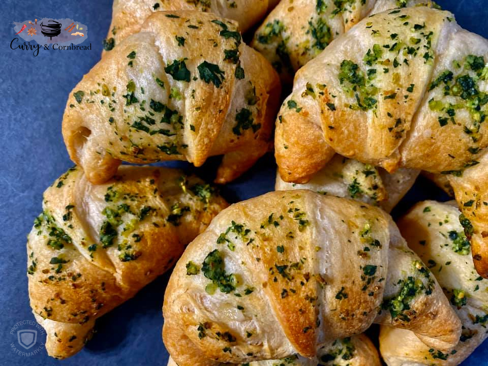 Thaw your crescent rolls ahead of time to get the perfect rise. Preheat oven to 350F. Line a rimmed baking sheet with parchment paper and set aside. In a small bowl, combine melted butter with finely minced garlic and cilantro. Unroll crescent rolls and separate into triangles. Place cheese piece at the widest end and roll up (tucking in the edges to seal) making it crescent shape. Brush with garlic butter mixture on top of the rolls. Bake for 10-12 minutes, until lightly golden brown.