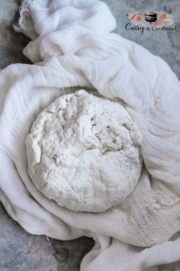 Line a strainer with a muslin cloth or cheese cloth and place this over another vessel. Strain the paneer into the cheesecloth and collect the whey into the bottom. Use the whey for kneading roti dough, because the whey helps makes amazing soft rotis! Let the curds sit in the cheesecloth in the strainer until they are cool enough to handle. Gather the cheesecloth around the cheese and squeeze gently to remove the excess liquid. You can throw the cheese in the kitchen aid machine or hand massage the cheese for couple minutes. Wrap it back up in the cheese cloth. Place heavy pot on top and press for at least 30 minutes to an hour for perfect firm texture. Once your paneer is set, remove it from the cloth and cut it into any desired shape of choice. Your paneer is ready to use! If you are not ready to use immediately, place them in a zip lock bag and freeze them.