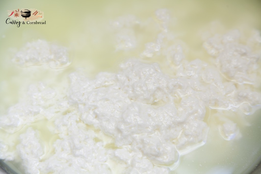 Heat milk in large deep nonstick pot over medium heat for approximately 18-20 minutes. Once the milk comes to boil, immediately turn off the stove. Pour in the lemon juice or vinegar mixture. Give everything a stir, and you should see the milk curdle immediately. If you don’t, you can add 1 more tbsp of lemon juice or vinegar. There will be yellowish water separated from the curds is whey water.