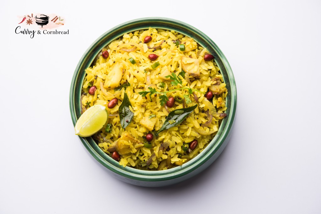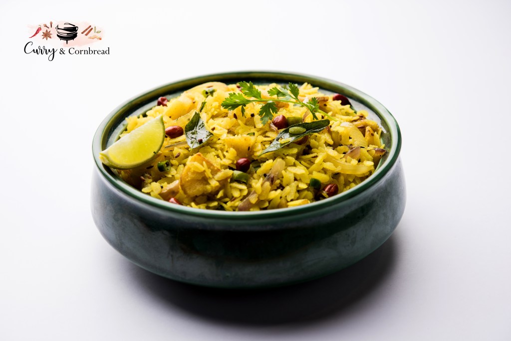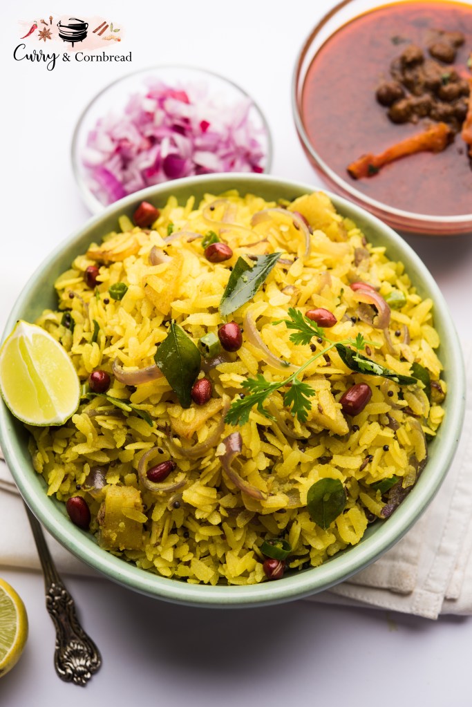 Many asked what is Poha? Poha or flattened rice flakes is made out of rice which is husked, cleaned and soaked in hot water. It is then pressed under rollers and dried. These off- white, paper thin flakes are very light and bland in taste. You can cook these with various methods and make into sweet or savory dishes. Poha is very versatile and comes in various thickness. The choice of vegetable is really up to you! If you travel all over india, you will find different varieties of Poha and how it is made! Even each household has their own unique recipe and versatile choice of toppings. I love to top mine off with aloo bhujiya sev but you can also add chevda, peanut bhujia, or even fruity toppings like pomegranate.