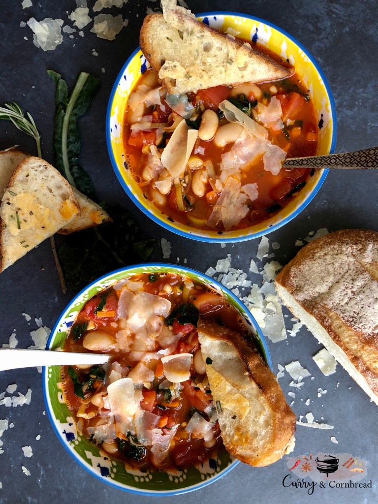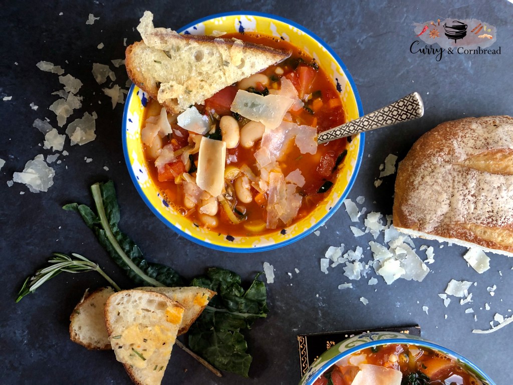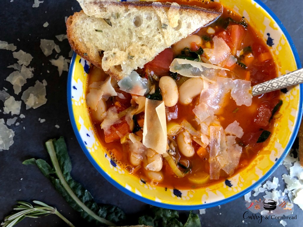 If you are going to eat the soup right away, I would also prep stuff to make rosemary cheesy bread on the side while the soup is cooking. Cut your artisan bread in 1 inch slices, arrange it on a baking sheet in single layer. Drizzle both side with olive oil, sprinkle some chopped rosemary, salt and pepper. Top it off with extra shaved parmesan cheese. Heat oven at 450F when you start cooking the soup. While you wait for the soup to come to boil, place the bread in the oven to bake. Bake until bread is golden, and cheese is melted.