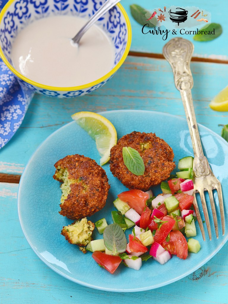 Generally we serve falafel on pita bread with tons of toppings and sauces but lately I have been craving salads. I love a good salad with tons of fiber and protein. I like to serve my falafel salad with tons of cucumbers, tomato, onions, tomatoes and green chilies. I love serving my falafel salad with homemade yogurt dressing, which was complete experiment, however its addictively delicious. If you are not fan of yogurt dressings then you can absolutely serve these with store brought hummus or tzatziki. However, you HAVE to taste it at least once, because my yogurt dressing is SO DAMN GOOD!