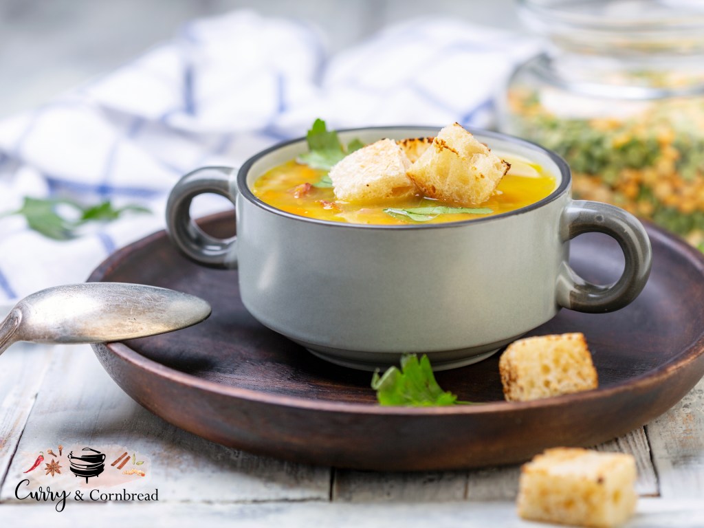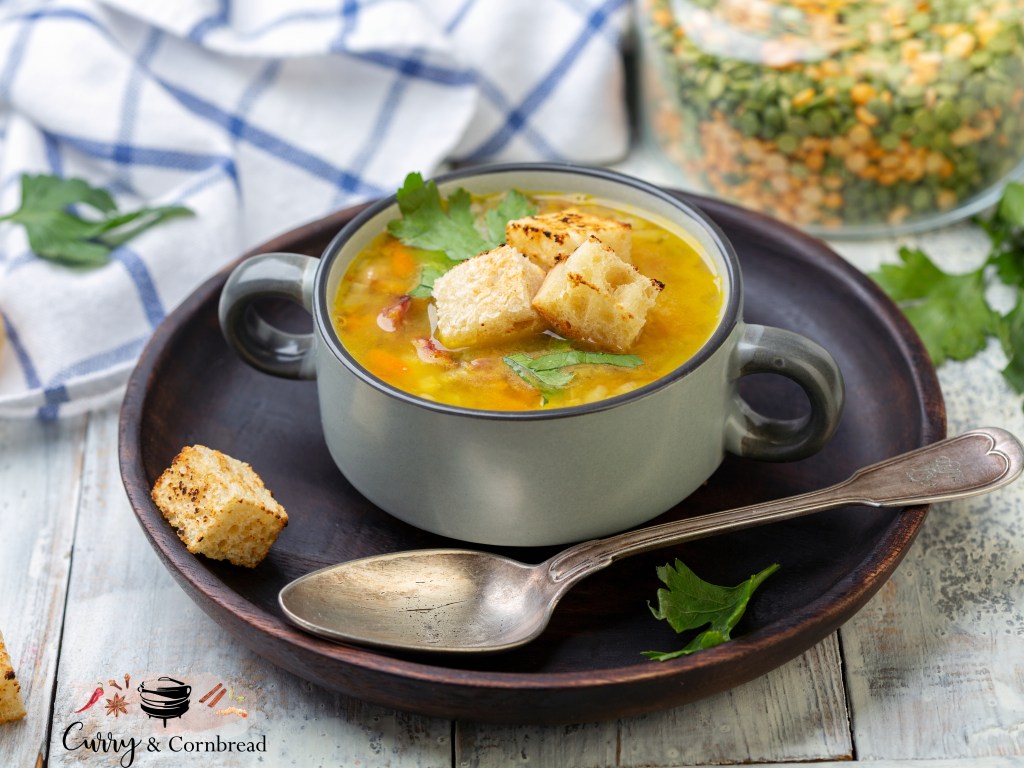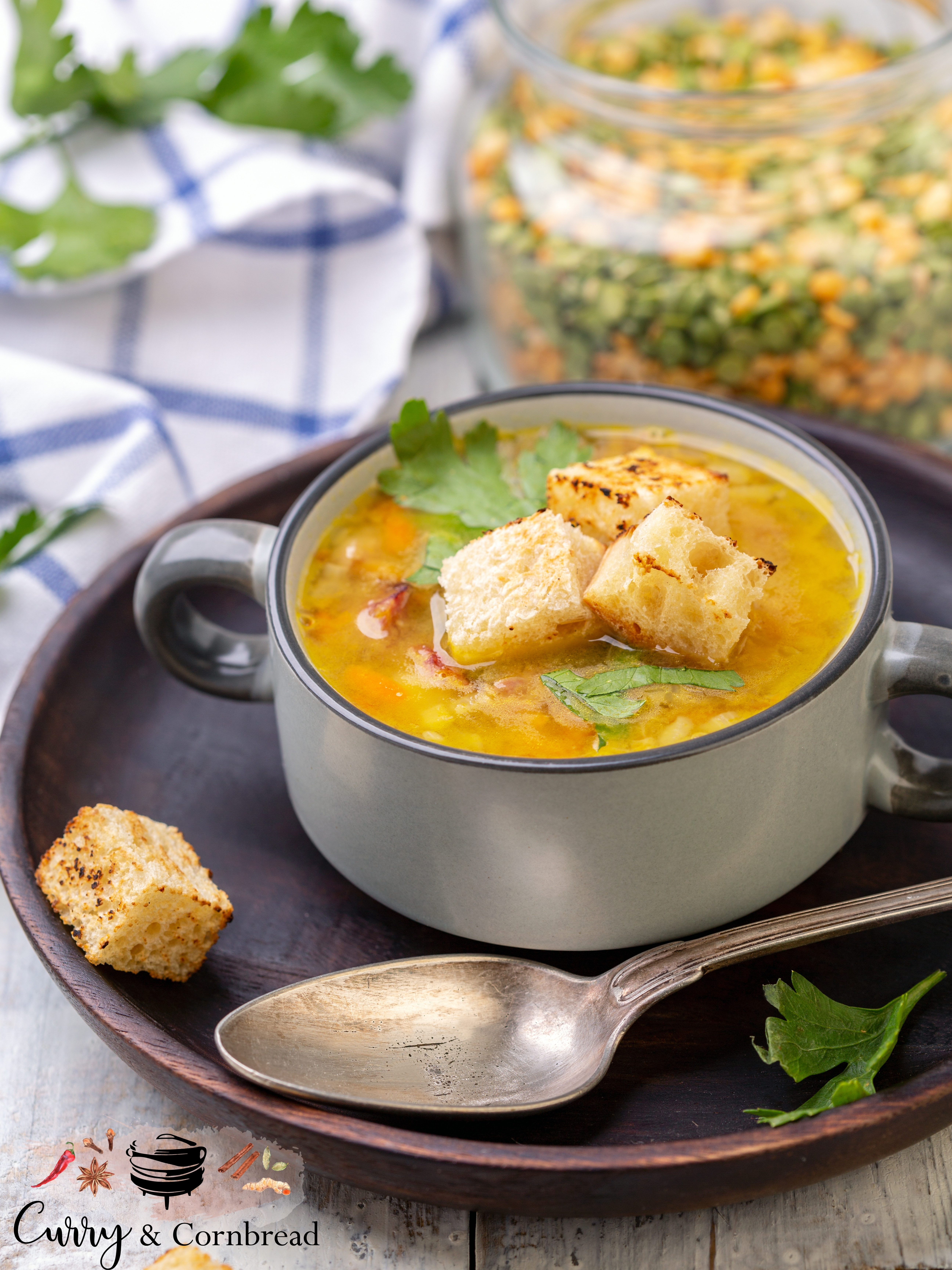 It only takes one hearty vegetarian soup to ignite a craving within your taste buds for more! Of course the best time to indulge in hot soups is when they thermometer drops, but that does not spot me from enjoying this recipe any other time of the year! Split pea soup is pure comfort food for many and it is surprisingly easy to make at home. My son and I love soups for lunch and they are perfect quick filling meals to change up the routine while getting all the veggie intake for the day. If you child is picky eater, then you can even hide those “not so favorite veggies” in the soup without any little ones knowing! My son loves to drink this soup with homemade french bread or store brought sourdough bread. I love this soup, especially when topped off with all the toppings along with baked cheesy garlic croutons. If you love soup as much as I do, then definitely you need to give this hearty soup a try! Hope you enjoy this as much as we do!