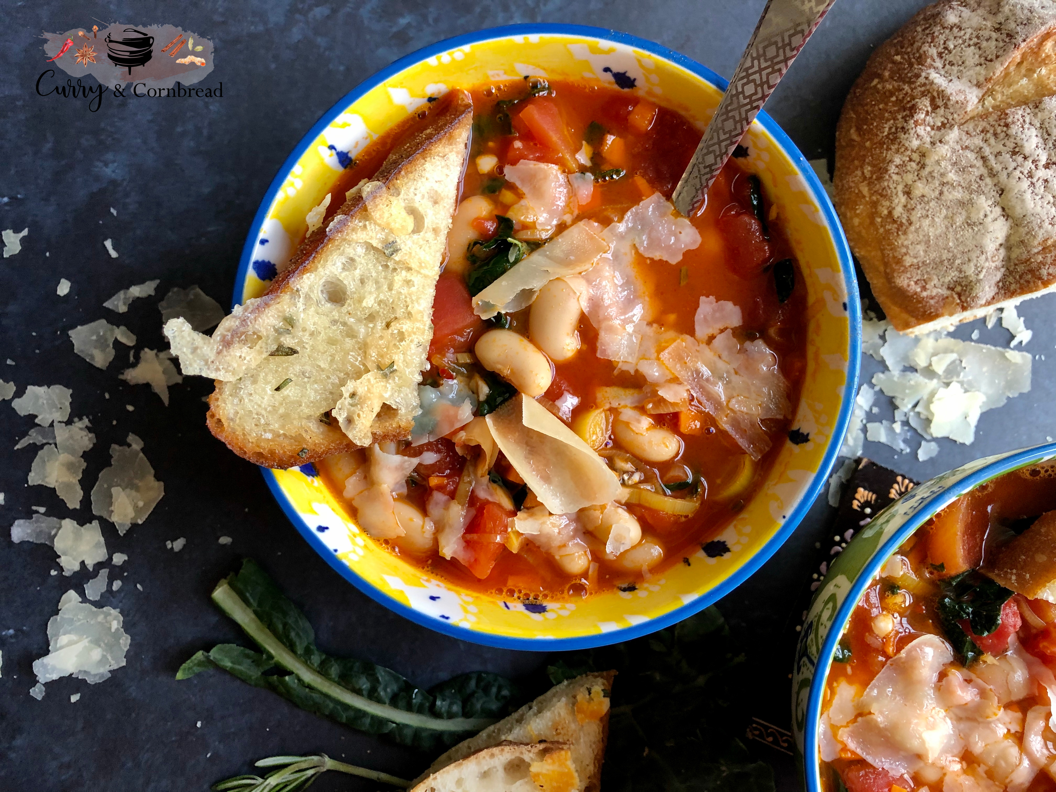 While soup is simmering, cut boule into 1 inch slices and arrange on baking sheet in a single layer. Drizzle both sides with EVOO, rosemary, salt and pepper. Top it off with half of sliced parmesan cheese. Bake until golden/cheese is melted. Lets go back to the soup; after 10 minutes are over, stir in kale and white beans. Continue to cook until kale leaves begins to wilt and remove from heat. Season with salt and pepper as desired.