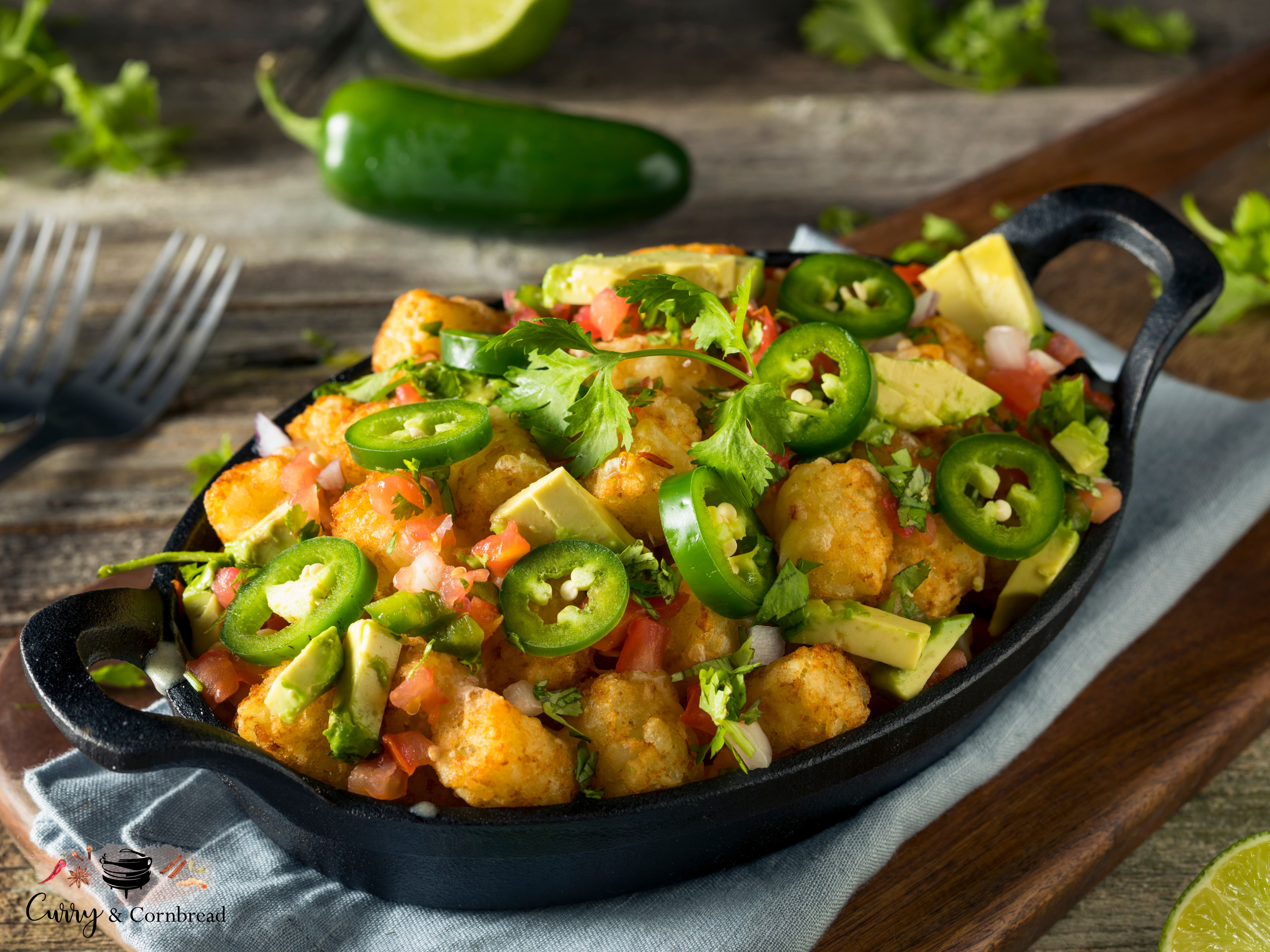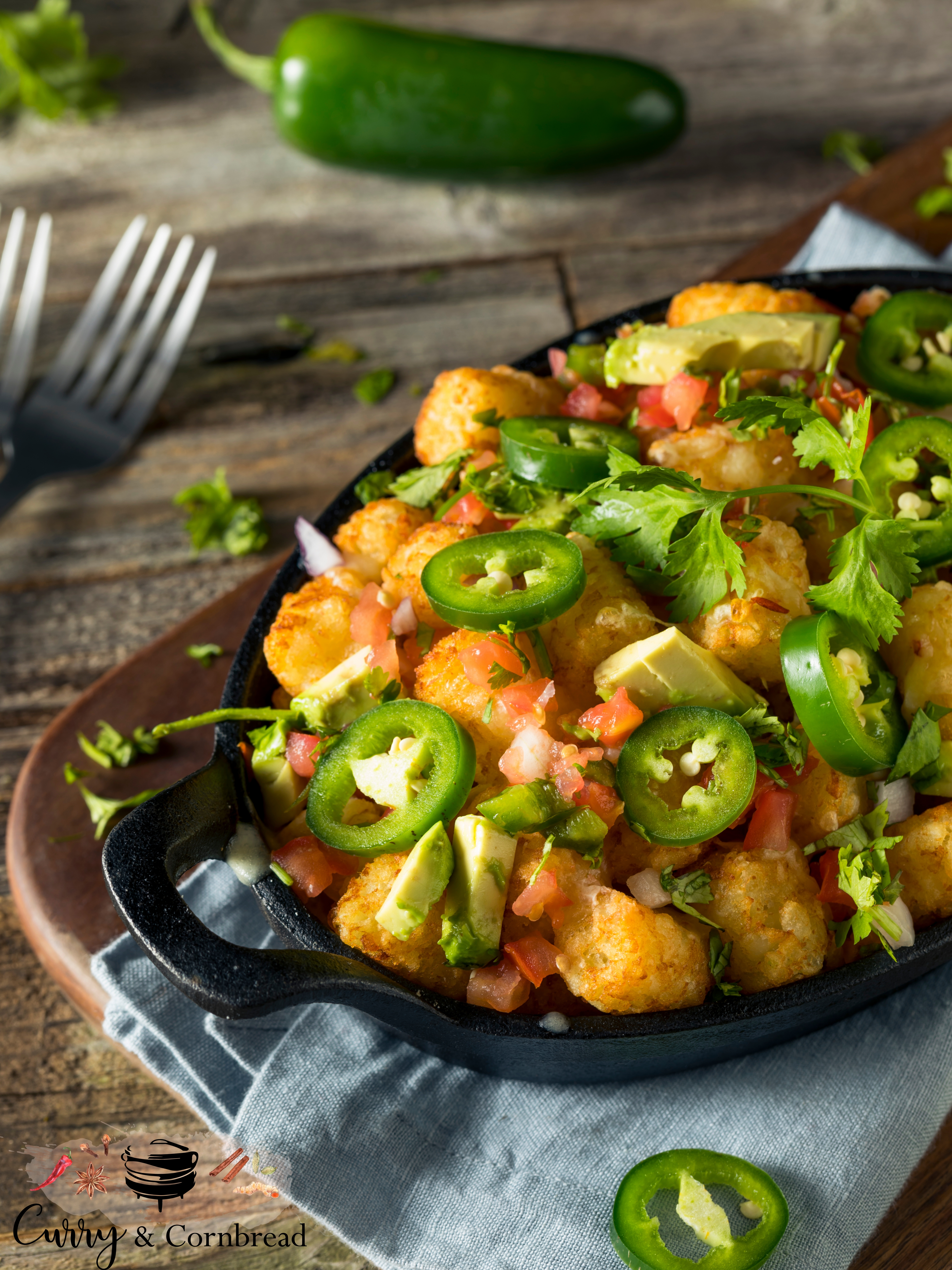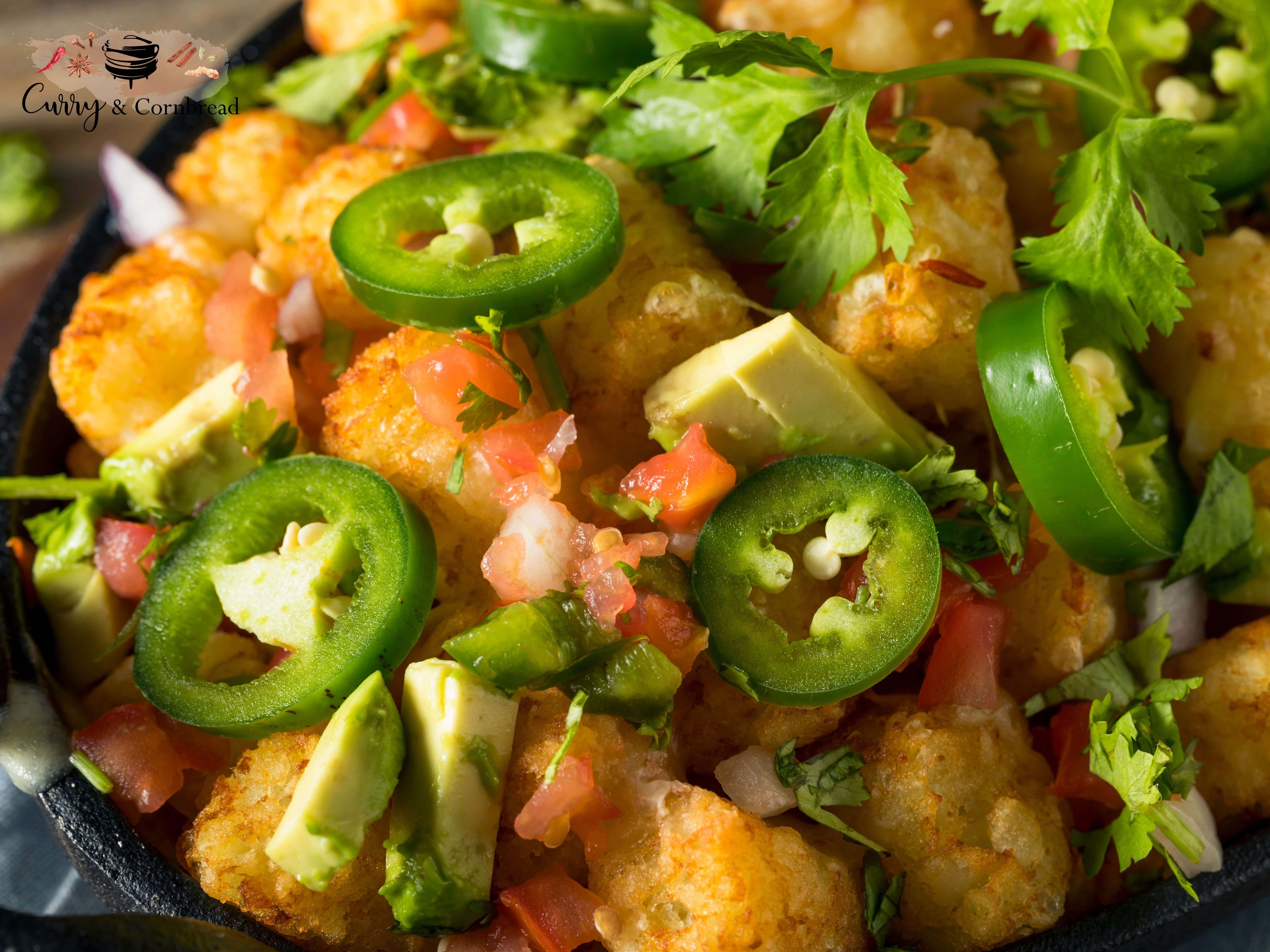 Preheat oven to 425. Arrange taters in a single layer on cast iron skillet or on baking sheet. Bake until golden brown and heated through, this process takes approximately 20 minutes. Remove from oven and top it off with cheese and bake until melted. Remove from oven and top them with the toppings (onion, tomato, avocado, jalapeno) as desired. Garnish your Totchos with cilantro. Serve immediately!
