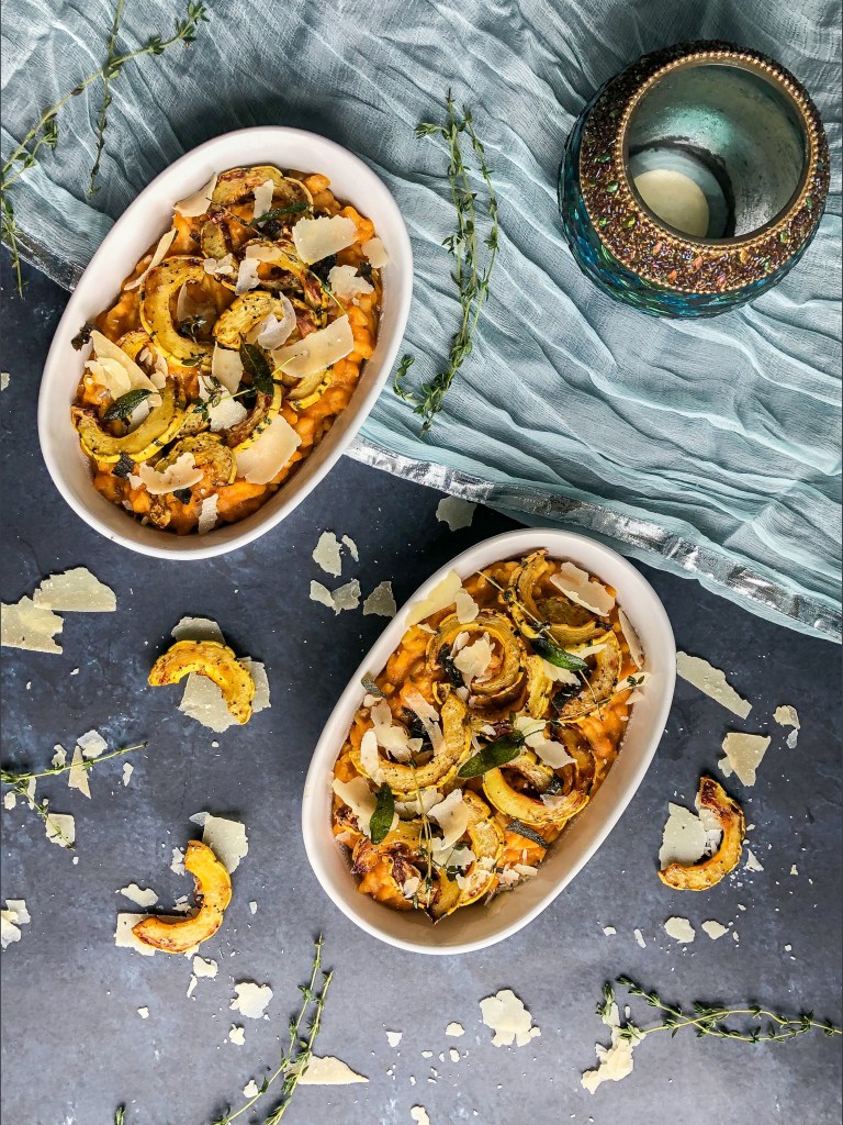 Add thyme leaves, 2 tsp of butter and 1/8 tsp of salt and pepper as desired to combine. Divide pumpkin risotto between serving plates and top with roasted delicata squash and crispy sage. Garnish with thyme and remaining parmesan. Dig in while its hot!