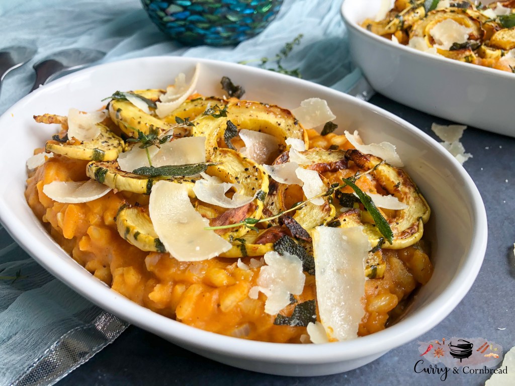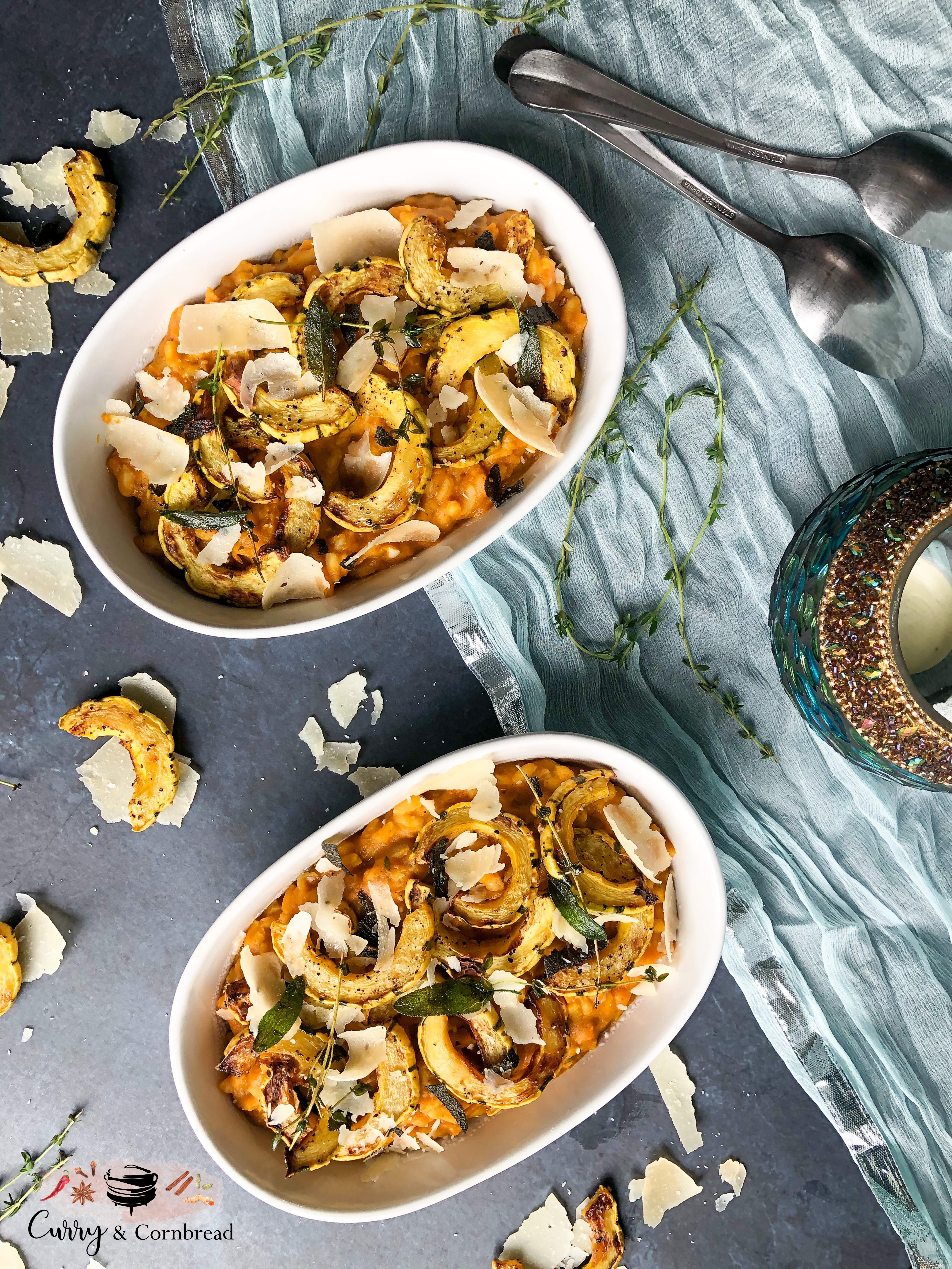 The arrival of fall has been slow, but steady. It came almost unnoticed. Now the leaves are turning, and morning fog came back. Fall and pumpkin are synonymous for me.. Once the calendar turns to October, I start craving all things pumpkin, all the time! And why not? Pumpkins are such a versatile vegetable delicious whether in sweet or savory dishes. I am not really fan of pumpkin desserts, however I am all in for savory pumpkin recipes, like pastas or curries. Everyone is in my family are big risotto fans. This Creamy Pumpkin Risotto is perfect cozy creamy, flavorful fall dish that you all need in your life! Vibrant pumpkin, earthy sage paired with squash and a little white wine to combine to create a truly delicious dish. I love how crispy sage not only adds the robust aroma but also a mild texture to the creamy risotto.