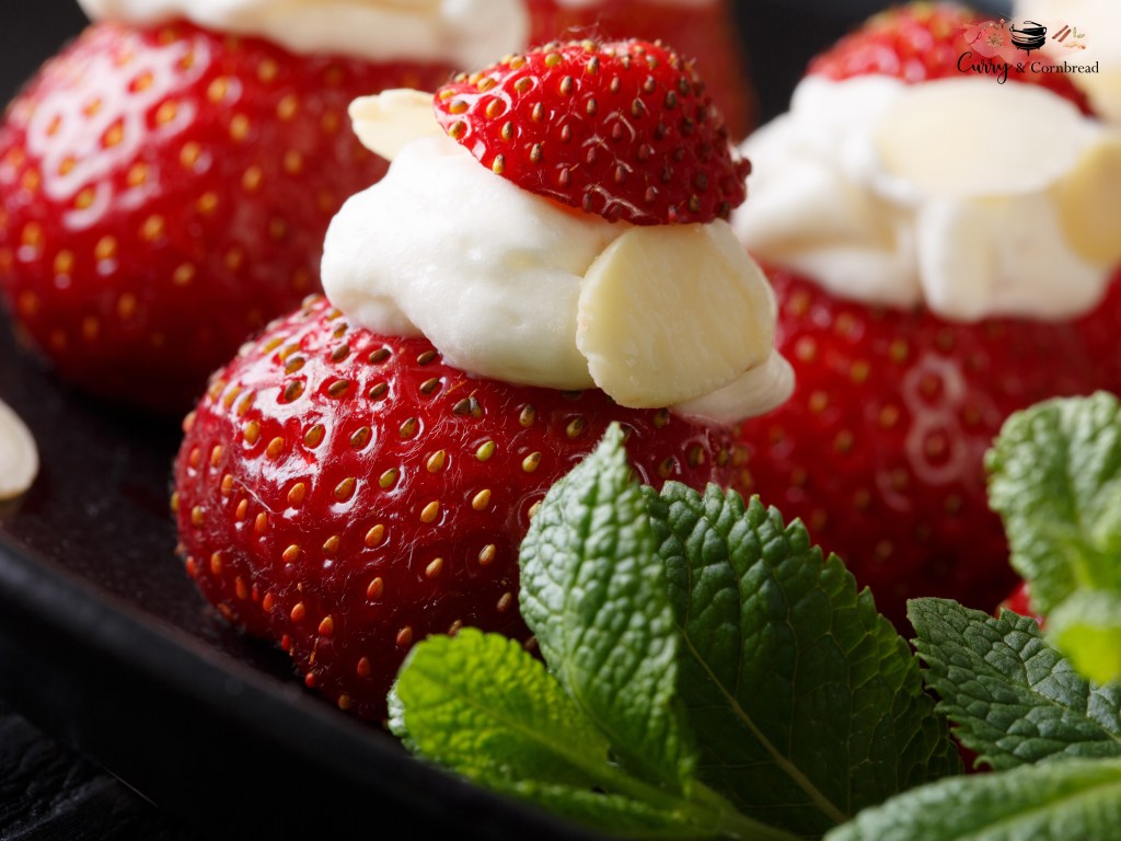Rinse strawberries and remove the stems from the strawberries, then use a melon baller to scoop out a hole in the top of each strawberry. Cut a small part of the bottom strawberry with a sharp knife to create a flat surface for them to stand on. Using a hand mixture, mix together the cream cheese, powdered sugar, vanilla extract until fluffy and light. Transfer the cream cheese mixture to a pipping bag lined with a star tip, and pipe the filling into each of the prepared strawberries. Top each cream cheese pile with a blueberry or with graham cracker crumbs, if desired. Serve and enjoy!